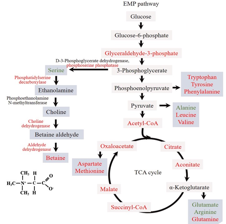 中科院海洋所劉建國研究員團隊采用一株從高鹽水體中分離的嗜鹽古菌(編號2020YC2),結合基因組、轉錄組、代謝組學和生理生化研究發現:該菌株具備完整的膽堿氧化途徑,可從頭合成甘氨酸甜菜堿;其合成底物源于絲氨酸,經膽堿氧化途徑產生;當葡萄糖作為唯一碳源時,絲氨酸由糖酵解中間代謝產物3-磷酸甘油酸轉化而來;甘氨酸甜菜堿合成積累量受外界鹽度的調節,隨著鹽度升高而增加;然而,當外界存在其它相容性有機物質海藻糖時,該嗜鹽古菌的胞內甘氨酸甜菜堿的含量并不隨外界鹽度的改變呈明顯的增減變化。