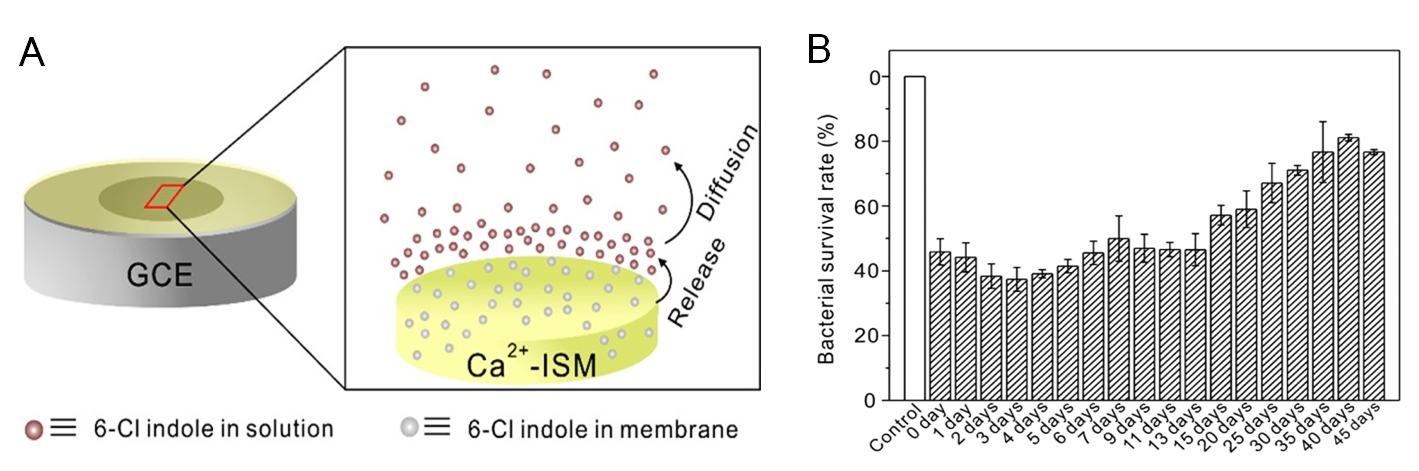 圖2. 基于6-氯吲哚緩釋的防污損聚合物膜電位型傳感器的結構(A)和長期防污損效果(B)