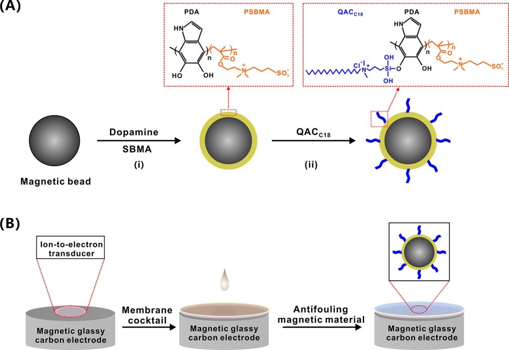 圖4. 磁性雙功能納米材料的合成(A)及可更新式防污損傳感器的構建(B)示意圖