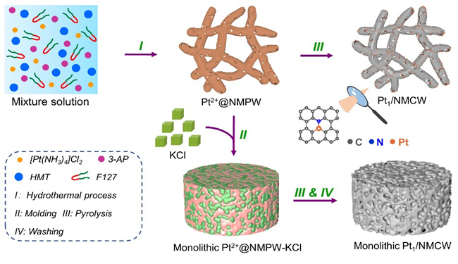 碳載單原子催化劑在多相催化領域受到廣泛關注。但是,在碳載單原子催化劑合成過程中,大量單原子被嵌入到碳基底或微孔孔道中,引起傳質限制,導致催化性能降低。另外,碳載單原子催化劑通常是以納米/微米級的粉末態存在,在實際應用中需要添加膠黏劑,通過壓片、擠條等手段成型,這一過程會導致催化劑孔道堵塞,活性位點包埋,大幅降低催化劑的效率。