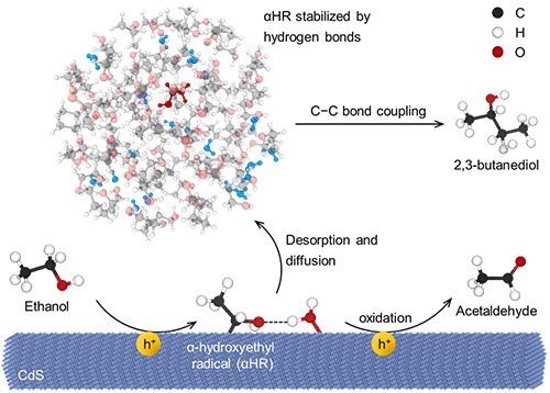 近日,中國科學院大連化學物理研究所生物能源化學品研究組副研究員羅能超和研究員王峰團隊在醇的光催化偶聯反應選擇性調控方面取得新進展。團隊通過向反應中引入水,加強了乙醇之間的氫鍵強度,從而有利于關鍵自由基中間體從半導體表面脫附并被溶液相(乙醇/水)穩定,提高了乙醇光催化C-C鍵偶聯轉化為2,3-丁二醇的反應速率和選擇性。