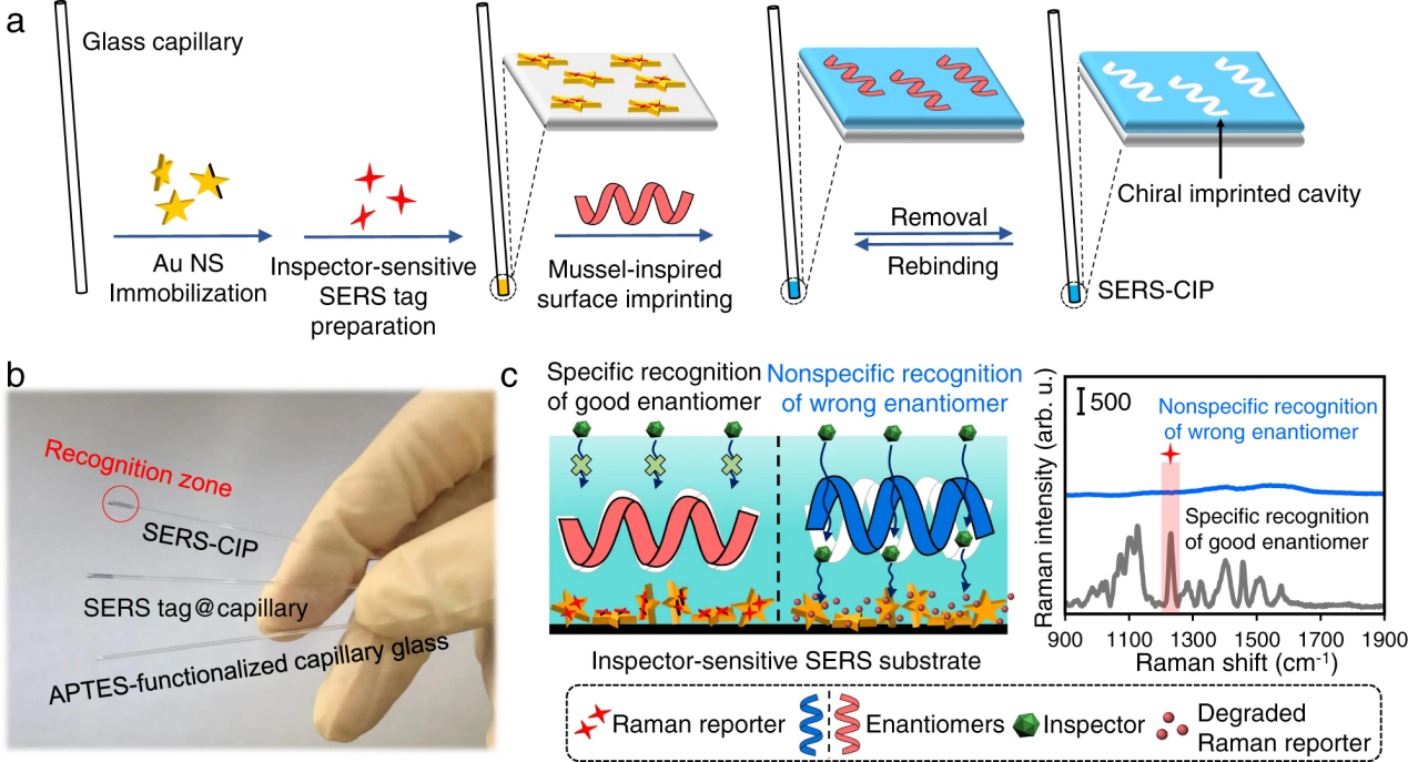 圖1. a) SERS-CIP檢測(cè)策略示意圖;b)含SERS標(biāo)記物的SERS-CIP玻璃毛細(xì)管照片,識(shí)別區(qū)域用紅色圓圈表示;c)在SERS-CIP上實(shí)現(xiàn)手性氨基酸識(shí)別檢測(cè)原理