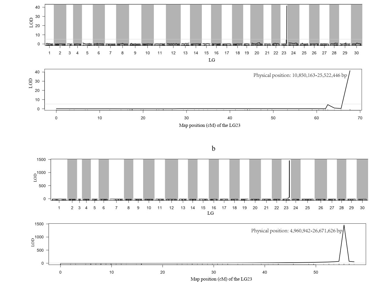 海藻種質(zhì)庫研究人員將具有雌雄同體表型的單倍配子體與雌性單倍配子體進行雜交獲得孢子體,經(jīng)減數(shù)分裂后大規(guī)模構(gòu)建了子代單倍配子體克隆家系。以前期完成的裙帶菜基因組為參考,利用重測序技術(shù)開發(fā)多態(tài)性SNP標記并構(gòu)建高密度遺傳圖譜。由此發(fā)現(xiàn)62個SNP與性別性狀緊密連鎖,它們位于23號連鎖群67.67 cM的位置,對應(yīng)于23號染色體的一段長度為14.67 Mbp的物理區(qū)間。