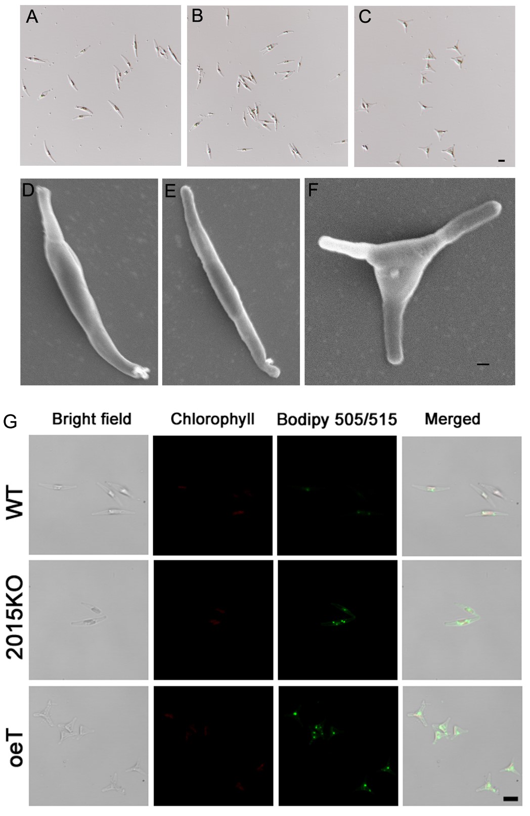 圖2 WT(A),Pt2015敲除(B)和過表達(C)藻株的顯微和掃描電鏡照片及Bodipy505/515染色(G)
