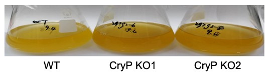三角褐指藻還富含活性物質如EPA,DHA和巖藻黃素等,其中巖藻黃素具有抗腫瘤、抗炎、抗氧化、減肥等多種功效,已成為海洋產業中的“明星產品”。過去主要從大型褐藻中提取巖藻黃素,然而得率低且品質不佳。目前,三角褐指藻已成為提取巖藻黃素的重要原材料。藻類生理過程與精準設計育種研究團隊利用基因編輯技術敲除了三角褐指藻的隱花色素基因(CryP),突變藻株的巖藻黃素含量顯著升高(圖3)。 這一研究成果將為巖藻黃素相關產業提供備選經濟藻株。