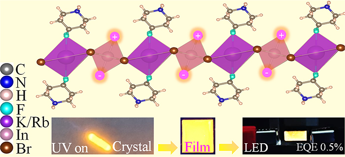研究人員發現,非鉛金屬鹵化物雙鈣鈦礦材料可在低溫溶液法制備,生產成本低。此外,由于自身結構的限域以及強烈的電—聲子耦合效應,雙鈣鈦礦材料具有獨特的自陷激子特性(STE),其復合發光表現出較大的斯托克斯位移及寬帶光發射,從而表現出白光發射的特點。在本工作中,科研人員通過利用有機分子4, 4-二氟哌啶(DFPD)和堿金屬之間的強化學鍵,制備了具有一維結構的(DFPD)2MIInX6 (MI= K, Rb; X= Cl, Br)雙鈣鈦礦化合物。其中,DFPD+不僅作為有效的層間間隔物來平衡電荷,而且可作為構成金屬鹵化物八面體的關鍵組分。特別地,(DFPD)2MIInX6中的電子態在空間上被限制在單個八面體中,產生了天然的電子限域效應。為了促進輻射復合,研究人員進一步采用微量Sb3+摻雜策略,將白光量子效率從5%提高到90%以上。由于所制備的低維雙鈣鈦礦材料具有高光電性能和優異的溶液可加工性,可以通過簡單的溶液法制備基于該材料的單組分暖白光LED,因此,該工作為下一代照明器件的設計提供新的思路。