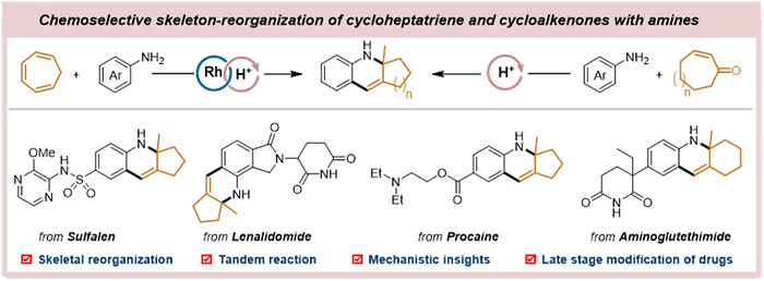 陳慶安團(tuán)隊(duì)一直致力于發(fā)展不同催化體系,以實(shí)現(xiàn)烯烴、炔烴的精準(zhǔn)轉(zhuǎn)化。在前期相關(guān)研究的基礎(chǔ)上(Angew. Chem. Int. Ed.,2019;Angew. Chem. Int. Ed.,2020;Angew. Chem. Int. Ed.,2021;Angew. Chem. Int. Ed.,2021;Angew. Chem. Int. Ed.,2021;Nat. Commun.,2021;Angew. Chem. Int. Ed.,2022;Nat. Chem.,2022;Nat. Catal.,2022),本工作中,該團(tuán)隊(duì)利用銠/酸協(xié)同催化體系,實(shí)現(xiàn)了環(huán)庚三烯的選擇性氫胺化反應(yīng),生成含并環(huán)結(jié)構(gòu)的1,2-二氫喹啉化合物。機(jī)理研究表明,該反應(yīng)先后經(jīng)歷了連續(xù)氫胺化、逆-Mannich開環(huán)以及Povarov環(huán)化,實(shí)現(xiàn)全碳環(huán)骨架重構(gòu)的過程。在反應(yīng)機(jī)理的指導(dǎo)下,該團(tuán)隊(duì)發(fā)現(xiàn),如果以環(huán)烯酮為反應(yīng)原料,在簡單鹽酸的催化下也可以實(shí)現(xiàn)該類產(chǎn)物的合成。該研究為環(huán)狀分子的骨架編輯與重排反應(yīng)提供了新的思路。