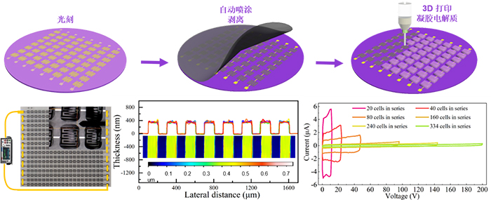 為適應小型化、可穿戴、可植入微電子設備的快速發展,需要發展具有小體積、高集成度、高性能和高兼容度的微型儲能器件。平面微型超級電容器由于無需隔膜和外部金屬連接線的特殊結構,同時具有可靠的電化學性能和易于調控的連接方式,在微電子領域有著重要的發展潛力。然而,由于缺少可靠的高精度微電極陣列制備和高效的電解液精確沉積技術,大規模制備高集成度、高性能的微型超級電容器仍具挑戰。因此,急需發展創新性的微加工技術,來實現規模化、穩定性地制備高度集成、高性能、可定制的微型超級電容器。