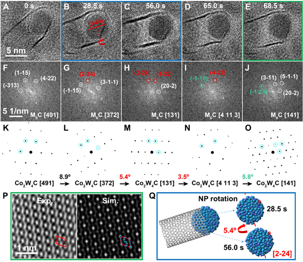 圖2.單壁碳納米管生長(zhǎng)過程中Co-W-C合金催化劑納米顆粒的物相結(jié)構(gòu)表征。(A-E)單壁碳納米管生長(zhǎng)過程中催化劑納米顆粒的時(shí)間序列HRTEM圖;(F-J)對(duì)應(yīng)的FFT花樣;(K-O)對(duì)應(yīng)的模擬電子衍射花樣(以Co2W4C為例);(P)圖E的傅里葉過濾HRTEM圖和對(duì)應(yīng)的模擬HRTEM圖;(Q)圖B,C中納米顆粒轉(zhuǎn)動(dòng)的原子模型圖。