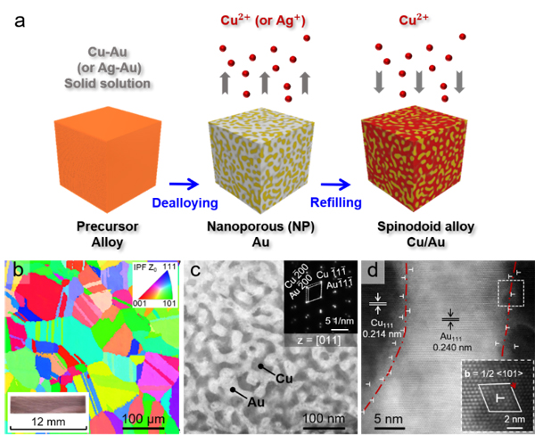 圖1 仿調(diào)幅分解結(jié)構Cu/Au合金的制備及結(jié)構特征。a) 脫合金與電沉積結(jié)合形成仿調(diào)幅分解結(jié)構的示意圖。b)EBSD照片顯示該材料粗大的晶粒尺寸,c)TEM照片顯示其雙連續(xù)納米雙相結(jié)構,以及d)HRTEM照片顯示半共格界面和高密度失配位錯。