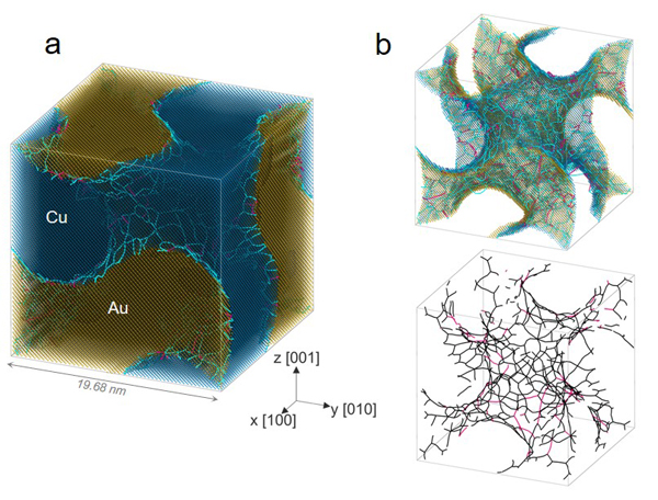圖2 仿調(diào)幅分解結(jié)構Cu/Au合金的分子動力學模擬。a)典型 Gyroid雙相結(jié)構及其光滑連續(xù)半共格界面,以及b)界面上大量失配位錯組成的三維位錯網(wǎng)絡。