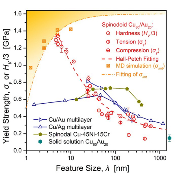 圖4 仿調(diào)幅分解結(jié)構Cu/Au合金屈服強度的晶粒尺寸效應。a)雖然該材料晶粒尺寸(d)比結(jié)構尺寸(