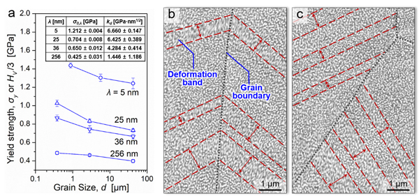 )高幾個數(shù)量級,其強度仍表現(xiàn)出顯著的晶粒尺寸(d)效應。(b-c)SEM照片顯示晶界對剪切帶有明顯的阻礙作用,與強度的晶粒尺寸效應相一致。