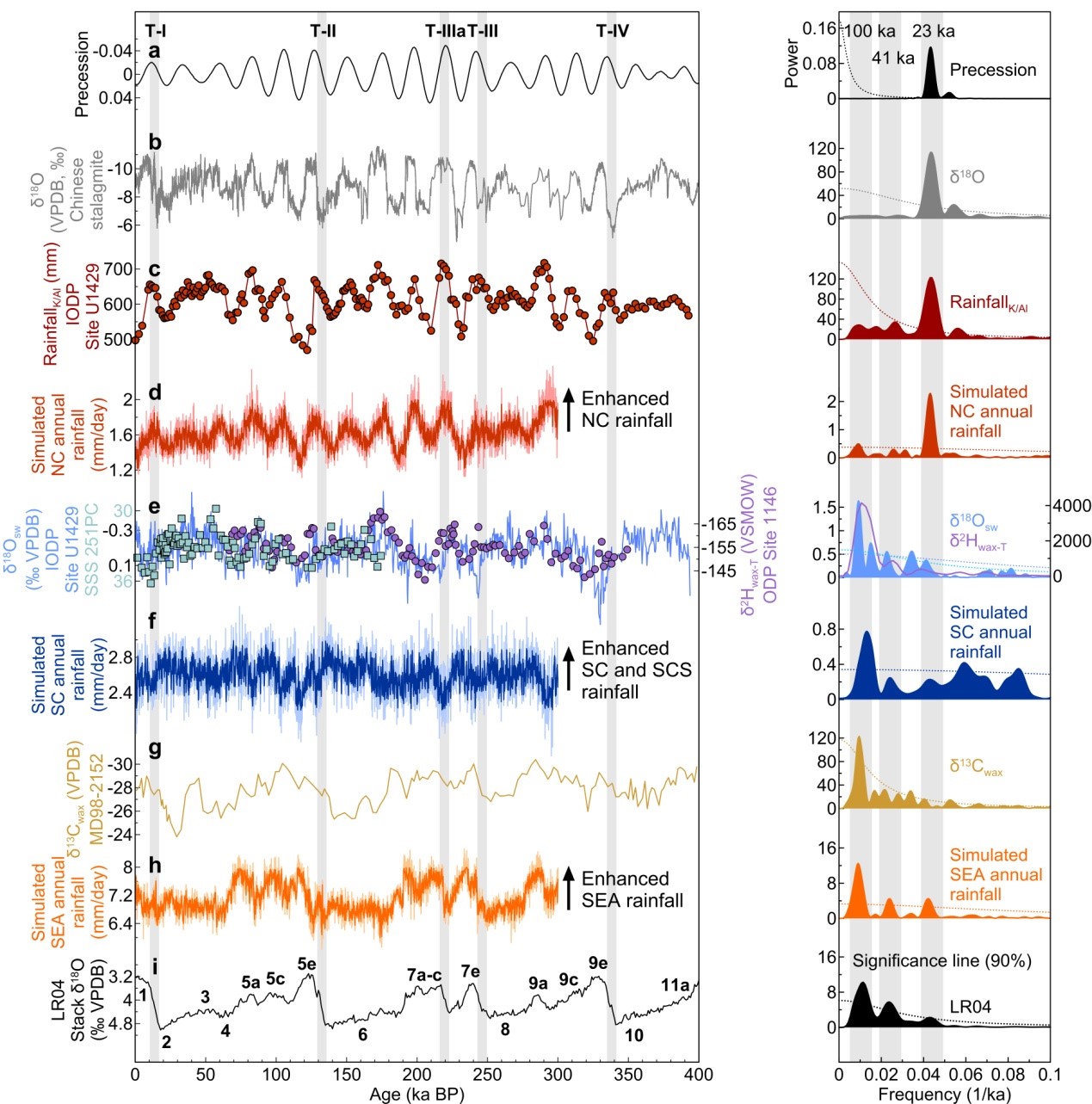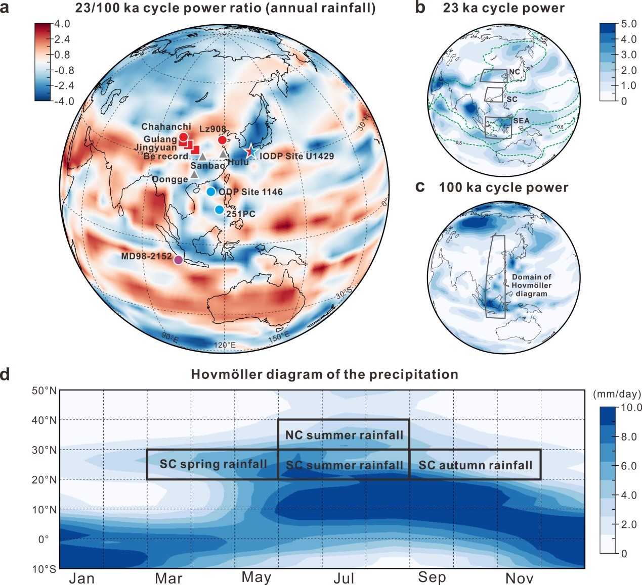 本研究基于沖繩海槽北部IODP U1429鉆孔沉積物,在查明沉積物為黃河輸入的基礎上,應用現代黃河流域沉積物硅酸鹽風化指標建立的風化-溫度-降水模型,定量重建了40萬年以來我國北方的降水演化歷史。與模擬結果一致,我們的降水記錄顯示出很強的2萬年周期。通過綜合對比,發現我國南方和東南亞西部的降水變化卻以10萬年周期為主。進一步研究表明,我國北方降水主要發生在夏季,因此與夏季太陽輻射變化密切相關。但南方除了夏季降水之外,春秋季降水同樣占比很大,冰期時春秋季南方水汽輻合作用增強,使得當地年降水凸顯了冰量變化的信號。而東南亞西部降水則主要受到與冰量變化相關的海平面變化,以及水汽輸送等過程的影響,因此也顯示出較強的冰期-間冰期旋回。