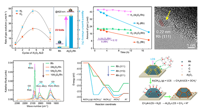 本工作聚焦光催化完全分解水體系中助催化劑表面的氫氧逆反應問題,以典型的可見光催化完全分解水的催化劑Rh/GaN-ZnO作為研究對象,通過原子層沉積(ALD)的方式將氧化鋁(Al2O3)沉積到光催化劑反應中心,可顯著提升光催化全分解水的活性。研究發現,ALD沉積Al2O3可以使Rh/GaN-ZnO上的逆反應降低90%,進一步通過光譜表征結合理論模擬證明,Al2O3主要沉積在Rh納米顆粒表面的低配位點上,揭示出Rh表面的低配位點是氫氧逆反應的主要反應位點。團隊通過ALD選擇性地將Al2O3沉積到Rh表面低配位點上,有效阻斷了氫氧逆反應的發生,從而將Rh/GaN-ZnO上可見光催化完全分解水的量子效率從0.3%提升至7.1%。此外,本工作還發現ALD選擇性沉積氧化物的策略還適用于其他貴金屬助催化劑,證明了這一策略的普適性。該工作明確了光催化完全分解水中氫氧逆反應的活性位點和機制,為解決這一挑戰性問題提供了一條新的普適性策略。