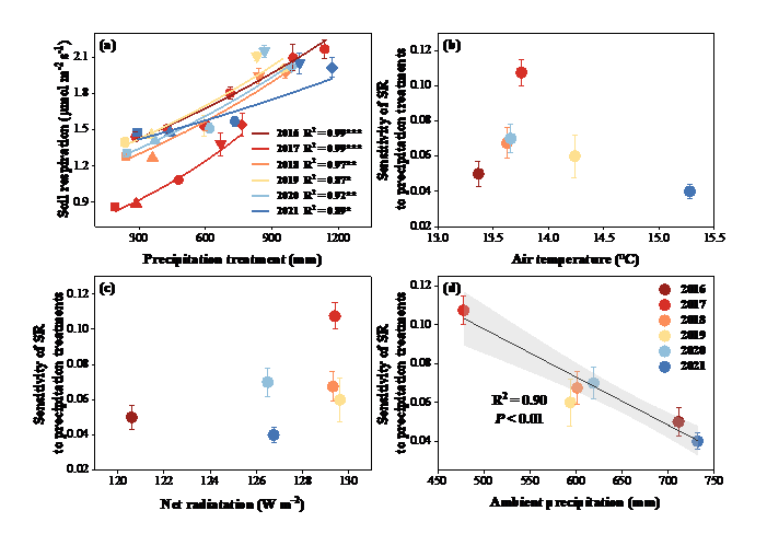圖1 2016-2021年不同降雨處理下的土壤呼吸和年降雨量之間的指數回歸(a),以及土壤呼吸對降雨處理敏感性與氣溫(b)、凈輻射(c)和降雨(c)的關系