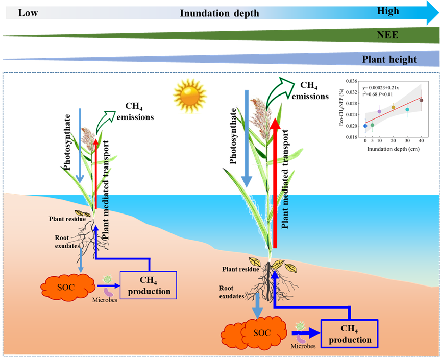 依托野外原位淹水深度控制試驗平臺(0、5、10、20、30和40cm淹水深度),通過濱海濕地土壤CH4排放、總生態系統CH4排放、凈生態系統CO2交換和植物性狀等長期定位監測,揭示了淹水深度對植物介導的CH4排放的影響。研究發現淹水深度減少了土壤CH4排放,但增加了總生態系統CH4排放(圖3)。在不同淹水深度條件下,植物介導的CH4排放占總生態系統CH4排放的99%。另外,淹水深度(0至20cm)強烈的刺激了植物介導的CH4排放。一方面,增加的凈生態系統CO2交換促進了植物介導的CH4產生,這可能是因為來自光合輸入的碳為產甲烷菌提供了能量和碳源。另一方面,植物高度與植物介導的CH4排放顯著相關,這表明植物性狀在CH4傳輸過程中起著重要作用(Zhao et al. 2023, Functional Ecology)。該研究強調了水文狀況和植物性狀在未來預測濕地生態系統CH4排放中的重要性。