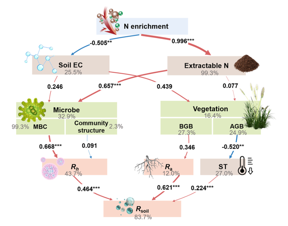 圖4 結構方程模型(SEM)描述了富氮對土壤呼吸(Rsoil)的影響機制