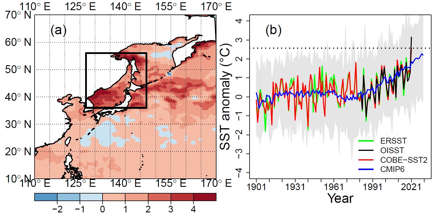 圖1. (a) 2021年7月西北太平洋區域海表溫度異常,圖中黑框為本研究關注區域;(b)不同觀測數據及CMIP6多模式集合平均的海表溫度異常區域平均時間序列