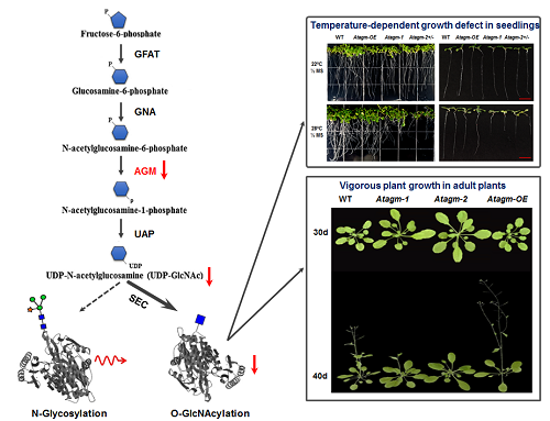 本工作中,團隊在模式植物擬南芥中鑒定了植物UDP-GlcNAc生物合成途徑的第三個酶,即N-乙酰氨基葡萄糖磷酸變位酶(N-acetylglucosamine phosphate mutase,AGM),并明確其酶學性質;進一步通過構建系列突變株發現,敲低AtAGM基因導致擬南芥UDP-GlcNAc含量顯著下降,進而突變株苗期出現溫度依賴性的生長缺陷,在成苗期生長則更加旺盛,蛋白組實驗發現成苗中生長相關蛋白顯著上調。糖基化水平定量分析發現,蛋白O-GlcNAc修飾水平在AtAGM敲低突變株中明顯下降,而N-糖基化影響不大。團隊進而利用O-GlcNAc糖基化突變體及抑制劑證實,蛋白O-GlcNAc糖基化水平受損是AtAGM敲低突變株出現表型變化的主要原因。因此,UDP-GlcNAc在植物生長發育過程的重要功能主要通過調控蛋白O-GlcNAc糖基化水平實現。