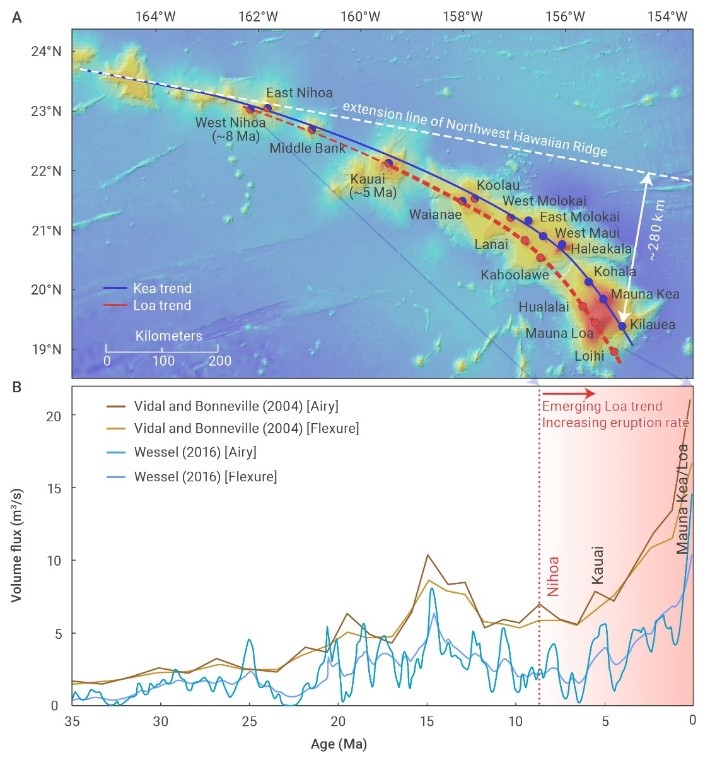 夏威夷-帝王海山鏈是固體地球科學的經典研究對象,在板塊構造理論和地幔柱假說的發展過程中起到了舉足輕重的作用。根據板塊構造理論和地幔柱假說,地幔柱保持基本不動,而板塊運動,因此地幔柱噴發形成的火山在板塊上留下成串的火山。最近800萬年以來,夏威夷海山鏈開始分叉為兩條近似平行的火山鏈,并出現偏轉。夏威夷地幔柱經歷了超過8500萬年的噴發,巖漿噴發速率自800萬年以來開始急劇增加,目前每年噴發量達到0.6立方千米(全球地幔柱平均噴發量為2立方千米)。