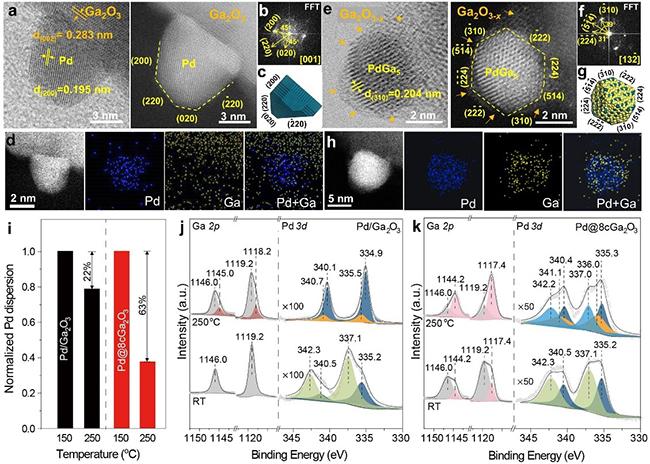 本工作采用基于STEM-XPS-XRD聯(lián)用的(準(zhǔn))原位表征方法,原位監(jiān)測(cè)了原子級(jí)厚度Ga2O3包裹的Pd/Al2O3倒置型催化劑(Pd@8cGa2O3)和負(fù)載型Pd/Ga2O3催化劑的金屬—載體合金化過(guò)程。結(jié)果表明,在250 低溫還原過(guò)程中, Pd@8cGa2O3由于界面增強(qiáng)效應(yīng)促進(jìn)了低溫合金化,形成PdGa5和PdGa等富Ga合金相,明顯區(qū)別于傳統(tǒng)負(fù)載型Pd/Ga2O3催化劑;而后者在400 以上才能發(fā)生RMSI,根據(jù)合金相圖,此時(shí)生成高溫穩(wěn)定的Pd2Ga相更為有利。在250 和4.5MPa的CO2加氫測(cè)試中,Pd@8cGa2O3的產(chǎn)物收率達(dá)到26960gMeOH+DMEkgPd-1h-1,遠(yuǎn)高于Pd/Ga2O3和Pd/Al2O3。漫反射紅外光譜(DRIFTS)進(jìn)一步揭示富Ga合金相對(duì)甲酸根中間體的生成和消耗速度更快,副產(chǎn)物CO的脫附受到抑制,從而有利于甲醇、二甲醚等含氧化合物的生成。