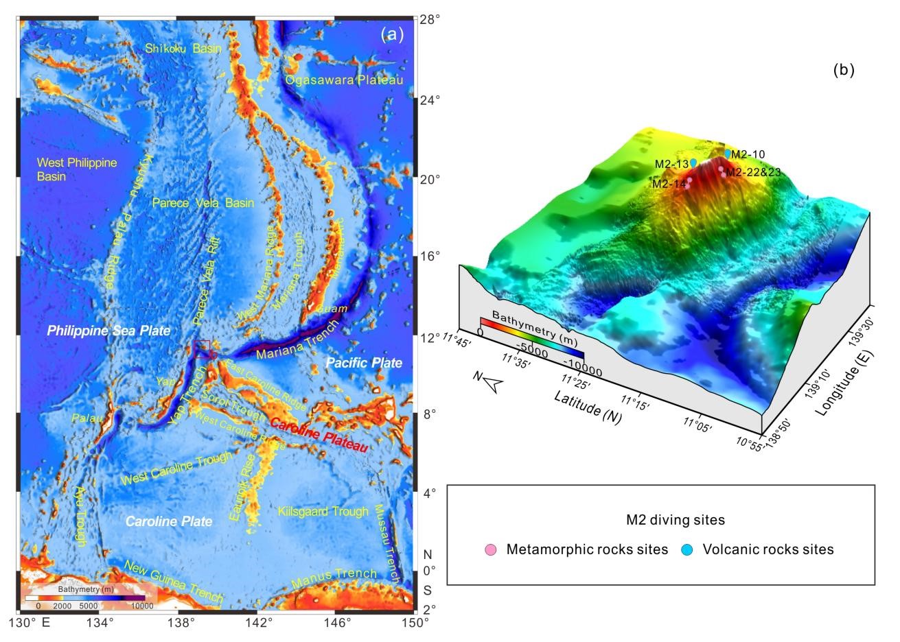 圖1 西太平洋海底地形和構造背景示意圖(a);馬里亞納俯沖帶最南端的弧前區M2站位的火山巖和變質巖樣品采樣位置圖(b)