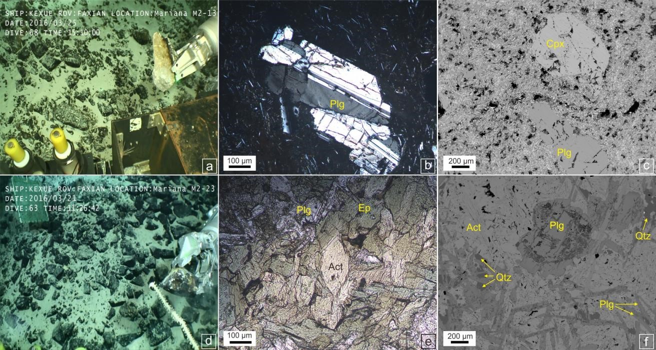 圖2 火山巖樣品(a-c)和變質巖樣品(d-f)的海底采樣、微區礦物組成、和背散射照片