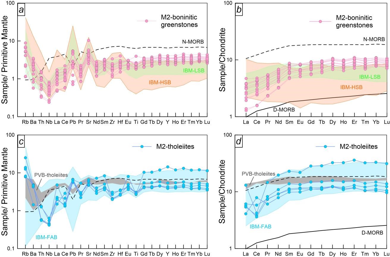 圖3 馬里亞納俯沖帶最南端M2站位的和玻安質綠巖(a-b)和火山巖樣品(c-d)的微量元素蛛網圖和稀土元素配分形式圖