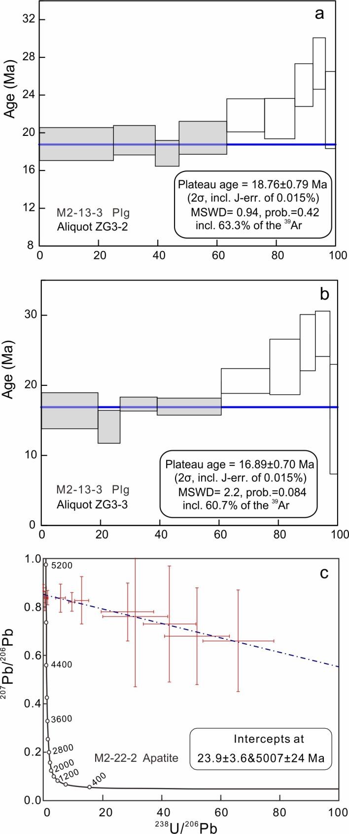 圖4 火山巖樣品(M2-13-3)的斜長石Ar-Ar定年結果(a–b);變質巖樣品(M2-22-2)的磷灰石U-Pb定年結果(c)