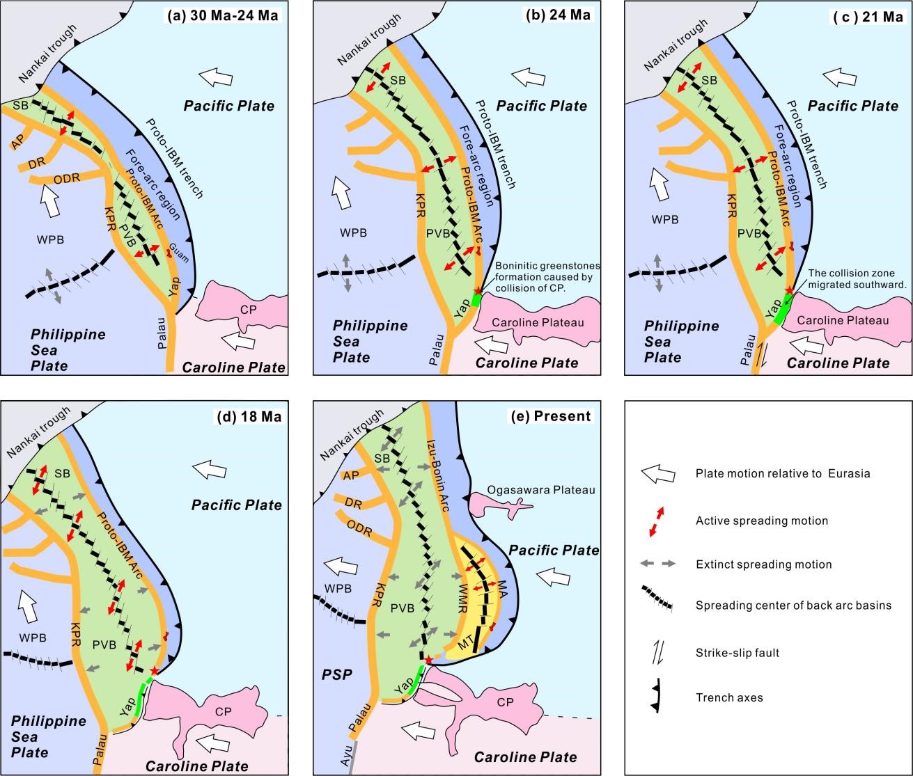 圖5 西南馬里亞納俯沖帶的構造演化模型:碰撞前階段(a)、碰撞階段(b-c)和碰撞后階段(d-e)