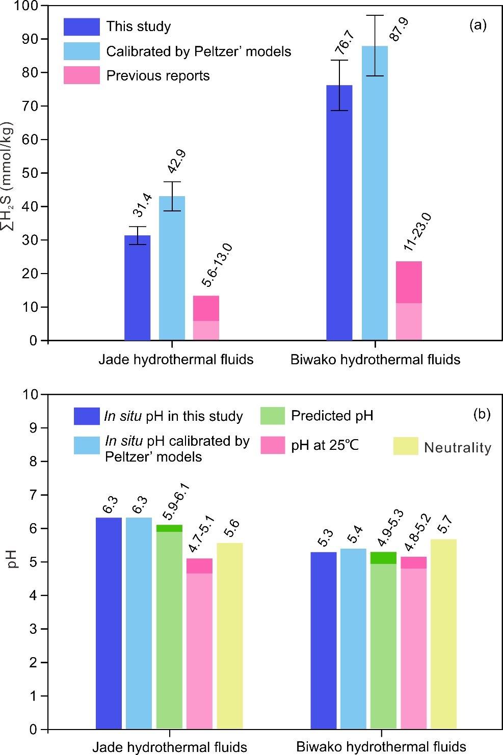 該研究發現具有厚沉積物覆蓋的高堿度熱液系統其高溫流體的pH在噴出降溫過程中會發生從弱堿性向弱酸性的轉變,流體酸性的增加是由于與海水混合過程中硫化物礦物的沉淀釋放了更多的氫離子,因此利用保壓流體取樣方式獲取的弧后熱液系統流體的pH為弱酸性,無法真實反映其高溫噴口流體為弱堿性的特征。該研究表明堿性熱液噴口不僅存在于Lost City這種受蛇紋石化反應控制的熱液區域,還可能在靠近大陸邊緣的受沉積物顯著影響的熱液區域普遍存在。
