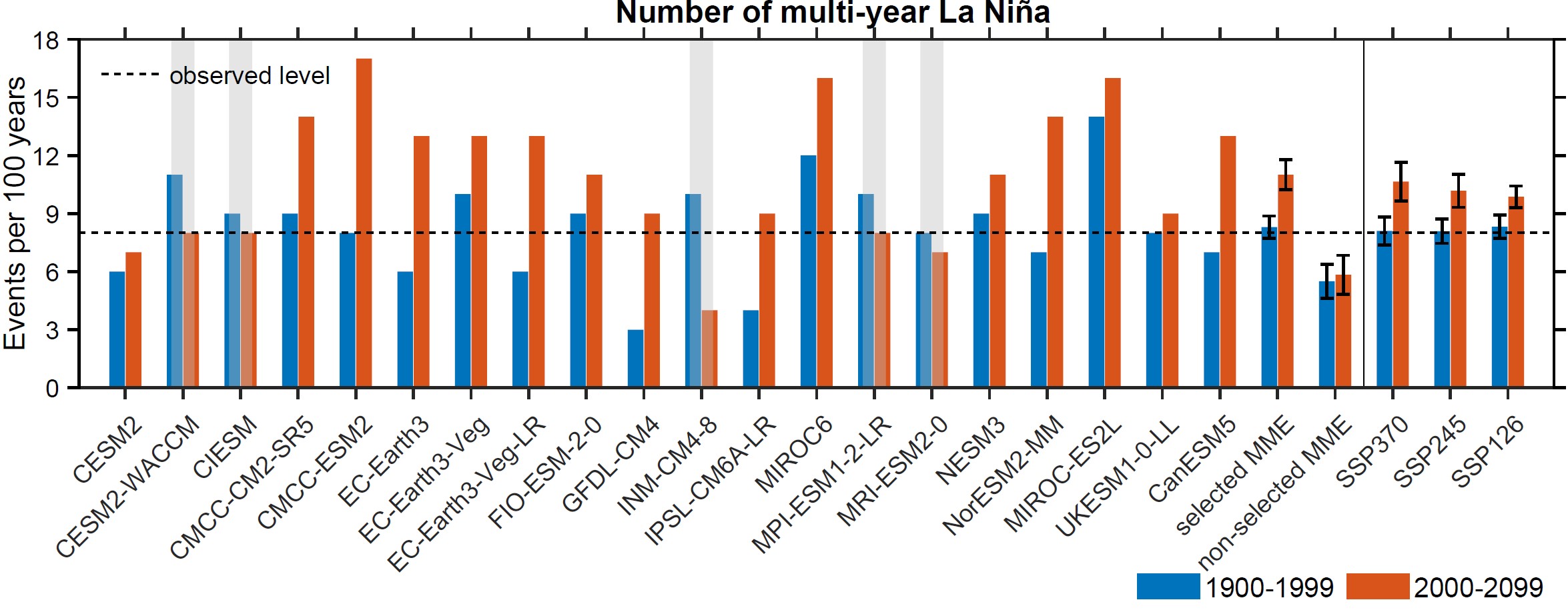 厄爾尼諾-南方濤動(ENSO)是地球氣候系統最強的年際變異模態,對地球多圈層產生顯著影響。其暖位相厄爾尼諾通常在一年內迅速成熟并衰減,但冷位相拉尼娜往往持續兩年以上成為“多年拉尼娜”。類似2020-2022年的多年拉尼娜事件會給全球氣候、農業生態環境及人類經濟社會帶來持續性和疊加性的破壞影響,并顯著提高極端天氣災害的發生風險。未來全球變暖情景下多年拉尼娜事件如何變化,是氣候變化研究領域持續關注的重大前沿科學問題之一,亟需解答。