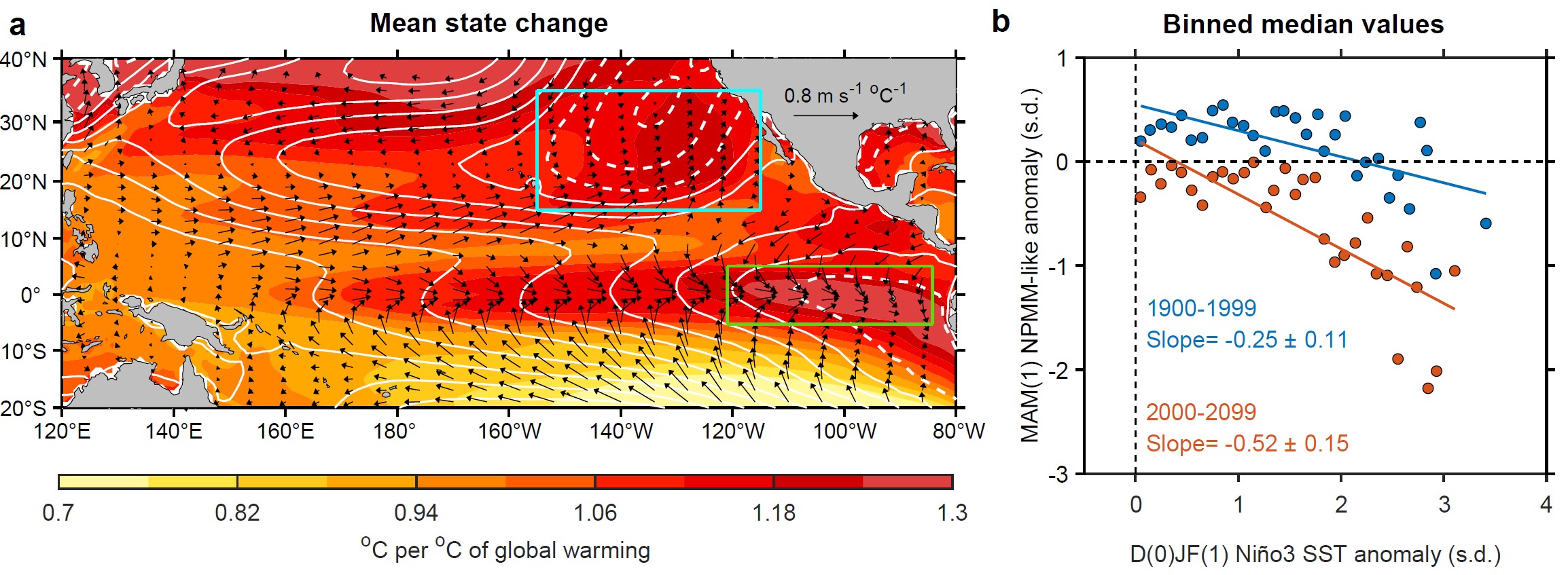 圖2(a)全球變暖后太平洋背景平均態的海溫、風場及海表面氣壓的變化 (b)全球變暖后,次年春季北太平洋經向模態對于前一年冬季熱帶東太平洋厄爾尼諾暖海溫異常的響應增強