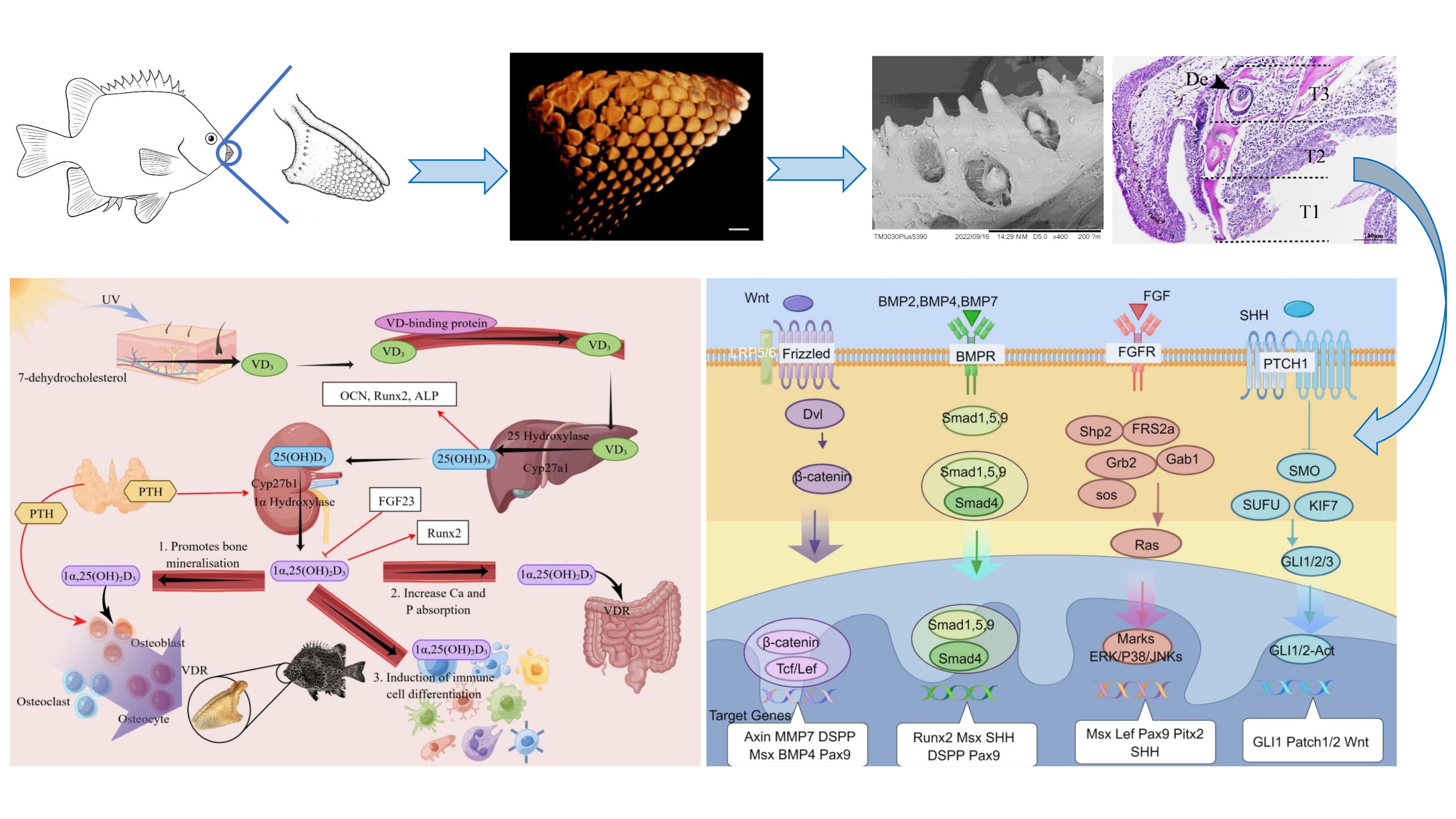 科研人員綜合采用形態解剖、掃描電鏡以及microCT 3D掃描成像等技術多角度系統研究了斑石鯛愈合型喙狀齒的發生發育特征,首次發現斑石鯛的愈合齒呈“嵌套”排布模式,頜齒齒式(4,15-16,10-1);確定了喙狀齒的早期發生發育關鍵時間節點(28dph初代齒萌發;40dph替換齒出現,頜齒開始愈合;45dph開始硬骨化;50dph喙狀愈合齒完成)(圖2)。此外,基于基因組學和轉錄組學等多組學聯合分析,獲得了11個(bmp2、bmpr2、smad1、wnt5a、msx、axin2、fgfr1a、fgfr2、pitx2、ptch1、cyp27a1)與斑石鯛喙狀齒的發育密切相關的關鍵基因及關鍵調控通路(Wnt、BMP、FGF、SHH),在斑石鯛頜齒愈合前、愈合中和愈合后協同調控頜齒上皮與間充質相互作用,促進成釉細胞及成牙本質細胞的持續增殖和分化(圖3)。此外,研究還發現Vd代謝及鈣積累密切相關的cyp27a1基因定位于斑石鯛上頜骨及頜齒基部,且在頜齒快速愈合期加速表達,促進維生素D代謝,進而調控斑石鯛頜齒牙胚內細胞分化以及牙釉質和牙本質礦化,為喙狀齒的愈合和發育提供鈣質基礎。該研究豐富了魚類牙齒發生發育理論及調控機制研究,為更好地理解生物頜齒的適應性進化和再生能力提供了新的見解。