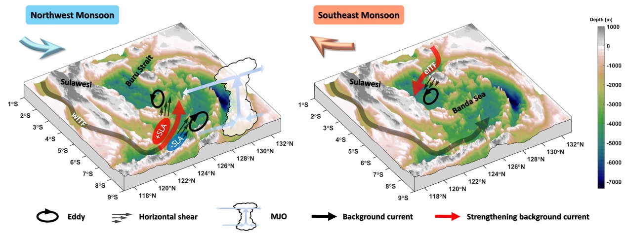 班達海地處印度尼西亞東部,是全球海洋大輸送帶的熱帶回流分支——印尼貫穿流(ITF)的關鍵通道。ITF的東分支與西分支在此交匯,使得北太平洋水團和南太平洋水團強烈混合。同時,班達海具有豐富的中尺度渦旋活動,強勁的渦旋會延長海水的停留時間進而允許混合過程來改變水團特性。然而,對于班達海渦旋活動季節變化及其驅動機制的認識尚不清晰。