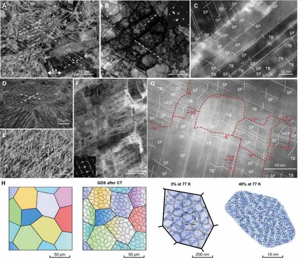 圖2 梯度位錯(cuò)結(jié)構(gòu)表層77 K拉伸結(jié)構(gòu)演變特征。拉伸應(yīng)變3%時(shí)截面SEM (A) 和TEM (B) 結(jié)果,晶粒內(nèi)不同滑移面上相互交割的層錯(cuò)束穿過多個(gè)位錯(cuò)胞;(C) 對(duì)應(yīng)的HAADF-STEM結(jié)果表明層錯(cuò)束包含超高密度的層錯(cuò)和孿晶結(jié)構(gòu)。拉伸應(yīng)變40%時(shí)截面SEM (D-E) 和TEM (F) 結(jié)果,晶粒內(nèi)已產(chǎn)生高密度細(xì)化結(jié)構(gòu)-納米層錯(cuò)疇;(G) 對(duì)應(yīng)的HAADF-STEM結(jié)果表明位錯(cuò)胞被極小層錯(cuò)疇進(jìn)一步細(xì)化;(H) 77 K拉伸變形過程中由原始位錯(cuò)胞逐漸轉(zhuǎn)變?yōu)楦呙芏葋喪{米層錯(cuò)疇的動(dòng)態(tài)結(jié)構(gòu)細(xì)化示意圖。