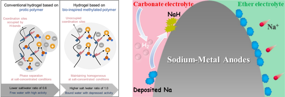 近期,固態能源系統技術中心在低成本鈉離子電池領域再獲重要進展,研究成果相繼發表在國際權威期刊《Angew. Chem. Int. Ed.》、《Adv. Energy Mater.》和《Energy Storage Mater.》上(圖1)。針對傳統水系電解質中的自由水分子導致析氫、電極金屬離子溶出等問題,研究團隊通過甲基化調節氫鍵作用獲得了鈉離子電池超高濃聚合物電解質新體系,鈉電池的循環穩定性實現突破性提高(Angew. Chem. Int. Ed. 2023, e202311589)。同時,研究團隊發現鈉金屬負極SEI中NaH是影響電池性能的主要因素,是導致鈉電池失效的一種重要機制,NaH是由電池循環中產生的氫氣和已沉積的金屬鈉自發反應生成的(Energy Storage Mater. 2023, 61, 102891)。研究團隊針對當前鈉離子電池電解質領域,進一步總結了當前鈉離子電池電解質中的基礎原理和研究進展,并對電解質未來發展方向進行了展望(Adv. Energy Mater. 2023, 2301758)。