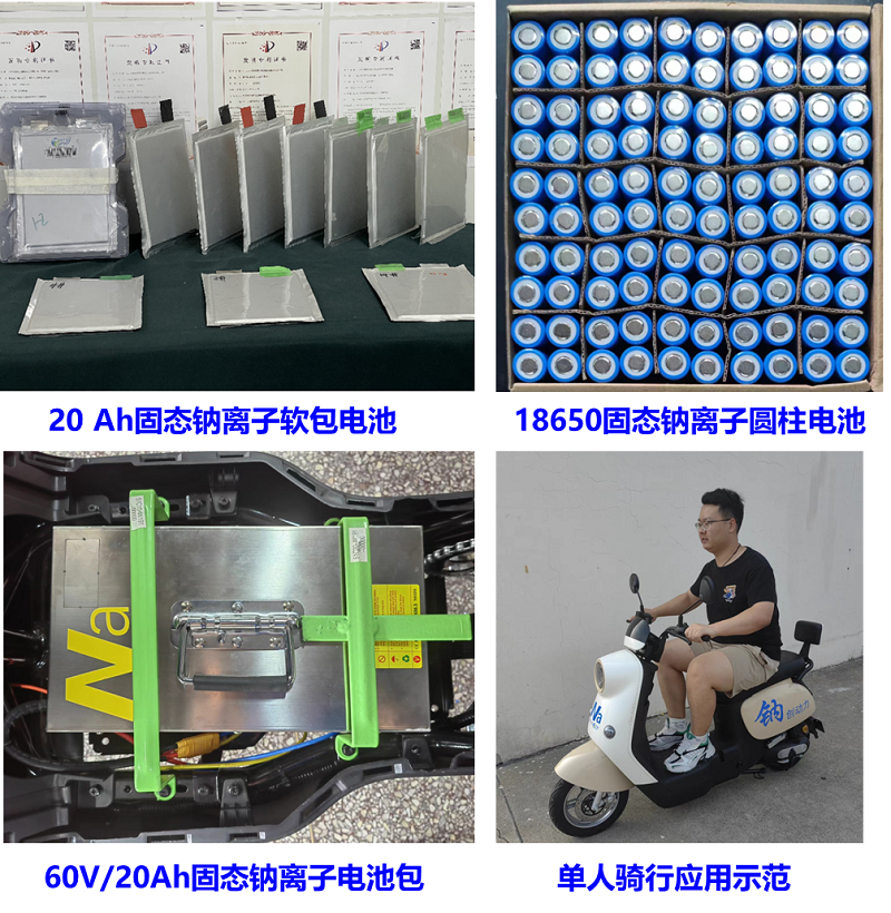 基于上述研究基礎和技術積累,經過十余年的努力,崔光磊研究員帶領的固態能源系統技術中心成功研制出低成本、高安全、高性能的固態鈉離子電池。目前研發的固態鈉離子電池電芯能量密度超140 Wh/kg,電池模組比能量密度超110 Wh/kg;具有超高安全性,可以通過針刺測試,不冒煙、不燃燒、不爆炸,已實現在二輪電動車的示范應用(圖2)。未來,該團隊將按照不同應用場景,重點瞄準低速電動車、新能源汽車48 V電源系統、家庭儲能等領域,持續開發滿足市場系列鈉離子電池關鍵材料和核心技術。