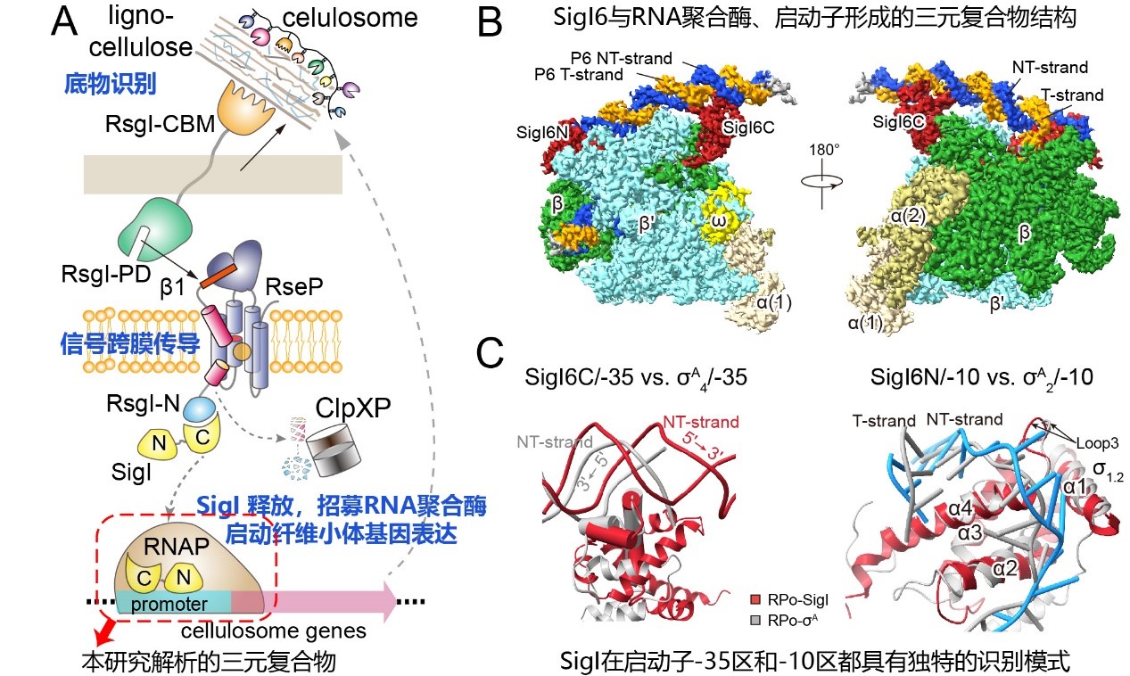圖1. 通過結構解析揭示SigI因子識別啟動子的機制。(A)SigI-RsgI通過感應底物調控纖維小體轉錄的機制。(B)包含SigI6的轉錄開放復合體的冷凍電鏡結構。(C)SigI6對啟動子-35和-10區的識別方式。