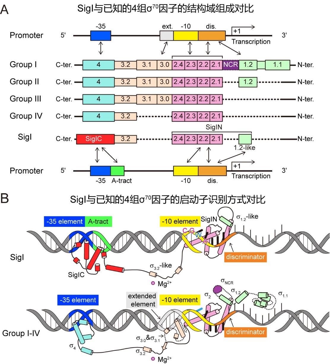 圖2 SigI因子具有和已知的4組 70家族 因子不同的結構域組成和啟動子識別方式。