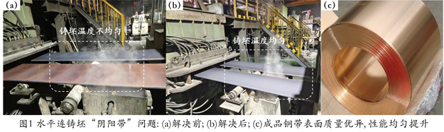 針對江銅集團(tuán)對銅板帶躋身國內(nèi)一流銅材企業(yè)的需求,金屬所科研團(tuán)隊于2021年1月1日起與江銅銅板帶公司開展“全面提升現(xiàn)有水平連鑄銅板帶產(chǎn)品質(zhì)量及穩(wěn)定性和成品率”項目研究。經(jīng)過兩年多的合作,在銅加工行業(yè)首次實現(xiàn)了銅合金水平連鑄板坯的在線超聲檢測,可對板坯內(nèi)部孔洞類缺陷和裂紋缺陷進(jìn)行實時圖像顯示和數(shù)據(jù)采集及處理。建立了水平連鑄結(jié)晶器冷卻水流動-多形式換熱-板坯凝固的多場耦合模型,實現(xiàn)鑄坯溫度場和組織場的準(zhǔn)確模擬計算。在此基礎(chǔ)上,進(jìn)行了銅套結(jié)構(gòu)和石墨模具材質(zhì)及結(jié)構(gòu)的優(yōu)化設(shè)計,調(diào)控了板坯熔鑄溫度場分布,解決了行業(yè)內(nèi)普遍存在的鑄坯單側(cè)晶粒粗大問題及陰陽帶問題。團(tuán)隊還創(chuàng)新性提出青銅水平連鑄坯“預(yù)軋-退火-粗軋”工藝路線,有效促進(jìn)了鑄坯孔洞缺陷愈合,提升軋后帶材表面質(zhì)量,解決了行業(yè)內(nèi)青銅板帶軋制起皮缺陷難以控制的共性問題。該技術(shù)可顯著提升銅板帶成品率,使江銅集團(tuán)的青銅生產(chǎn)水平達(dá)到國內(nèi)一流水平,提高了其技術(shù)水平和市場競爭力。