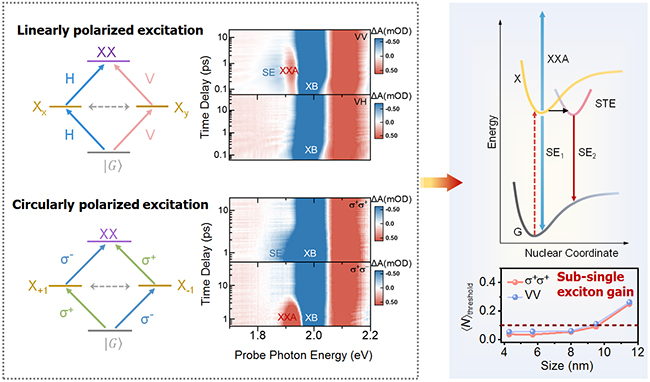研究團隊前期研制了偏振選控的飛秒瞬態吸收光譜,在此基礎上揭示了量子點激子自旋拍頻新機制(Nat. Mater.,2022),以及實現了室溫下的量子點自旋相干操控(Nat. Nanotechnol., 2023)。在本工作中,團隊基于該譜學方法清晰地在單激子漂白(XB)信號的紅端位置分辨出受激輻射(SE)和單激子態到雙激子態吸收(XXA)信號特征。基于激子偏振特性分析,團隊發現CsPbI3和CsPbBr3鈣鈦礦量子點的受激輻射都包含一個高能組分和一個低能組分,即一個較小Stokes位移的帶邊自由激子發射(SE1)和一個較大Stokes位移的瞬時自陷激子發射(SE2)。研究發現,當泵浦—探測脈沖光保持相同圓偏振時,雙激子吸收被抑制,這兩種發射的斯托克斯位移都足夠克服非均勻激子線寬,從而實現平均激子數小于0.1的增益閾值;當泵浦—探測脈沖光保持相同線偏振時,雙激子吸收會覆蓋帶邊自由激子的受激輻射(SE1),但是自陷激子的受激輻射(SE2)的Stokes位移仍然足以克服雙激子吸收并實現類似的低閾值光增益。該低閾值光增益現象在不同尺寸的CsPbI3和CsPbBr3量子點中均能被觀測到。