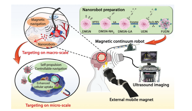 腦膠質瘤是嚴重危害人類健康的惡性腫瘤,患者中位生存期不到15個月,目前臨床采用的治療手段包括手術治療、放化療和靶向治療等。其中,靶向治療面臨著由于血腦屏障的阻隔使得大部分藥物分子不能夠進入腦組織的難題。中國科學院沈陽自動化研究所科研團隊與中國醫科大學附屬盛京醫院合作,研制了一套子母式微納米機器人系統,可經顱骨微創通道進入顱內,越過血腦屏障抵達膠質瘤部位,將藥物精準遞送到膠質瘤病灶。該研究以Dual-Responsive Nanorobot-Based Marsupial Robotic System for Intracranial Cross-Scale Targeting Drug Delivery為題,發表在最新一期材料領域國際頂刊《先進材料》(影響因子29.4)。