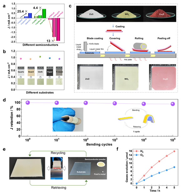 該液態(tài)金屬鑲嵌半導(dǎo)體顆粒的新型仿生人工光合成膜制備技術(shù)具有普適性好、膜結(jié)構(gòu)穩(wěn)定性高、易于規(guī)模化和原材料易回收等優(yōu)勢(shì)。利用商業(yè)化半導(dǎo)體顆粒(如ZnO、WO3和Cu2O等)結(jié)合通用輥壓技術(shù),可實(shí)現(xiàn)不同半導(dǎo)體光活性薄膜在各種基體上的規(guī)模化制備,所獲得的顆粒嵌入式薄膜的活性均顯著優(yōu)于傳統(tǒng)方法獲得的對(duì)照樣品。在柔性基體上集成的薄膜在大曲率彎折10萬(wàn)次以上仍可保持95%以上的初始活性。此外,利用簡(jiǎn)單的熱水超聲處理,即可將半導(dǎo)體顆粒、低溫液態(tài)金屬以及基體進(jìn)行分離回收再利用,且回收再集成制得的光活性薄膜表現(xiàn)出與原始薄膜近乎相同的活性(圖5)。