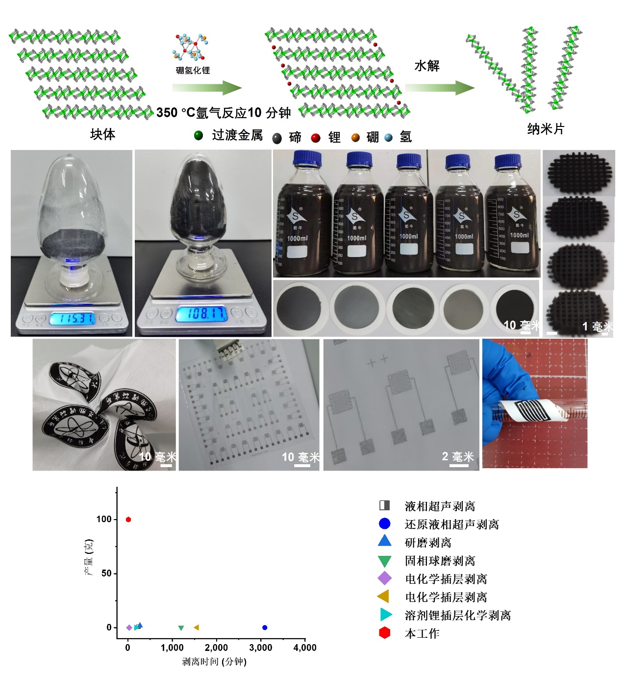 本工作中,吳忠帥團隊提出了一種固相化學插層剝離新方法,通過高溫固相反應降低插層反應的活化能,創新性地篩選出了一種固相插層試劑——硼氫化鋰,硼氫化鋰具有強還原性質,在干燥空氣中穩定,可用于實現高溫固相插鋰反應,克服了插層反應速度慢的問題,從而實現安全、高效、快速的插層剝離。整個插層剝離過程只需短短10分鐘,可宏量制備出百克級(108克)的碲化鈮納米片,與此前研究制備量均小于1克比,提升了兩個數量級。重要的是,該方法具有普適性,此方法成功制備出了五種不同過渡金屬的碲化物納米片(MoTe2、WTe2、NbTe2、TaTe2和TiTe2)和十二種合金化合物納米片,豐富了二維材料體系庫,實現了材料功能化、定制化制備。此外,團隊還觀察到多種有趣量子現象,例如MoTe2納米片具有依賴于厚度的金屬-絕緣體相變,WTe2納米片具有巨磁電阻和舒勃尼科夫-德哈斯效應等。