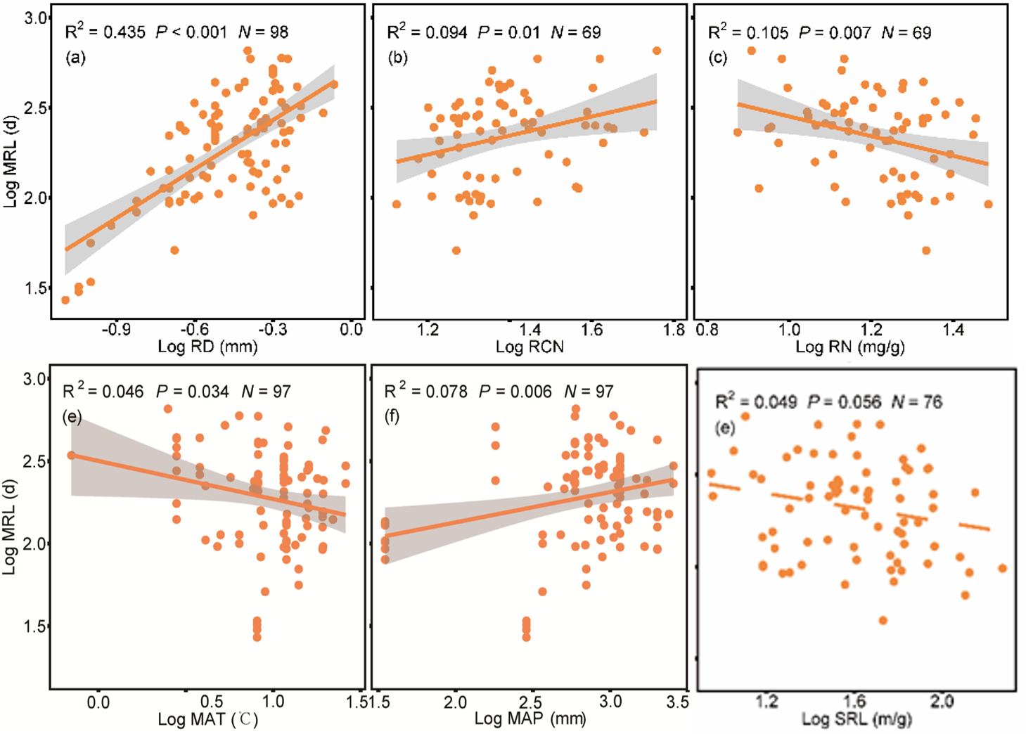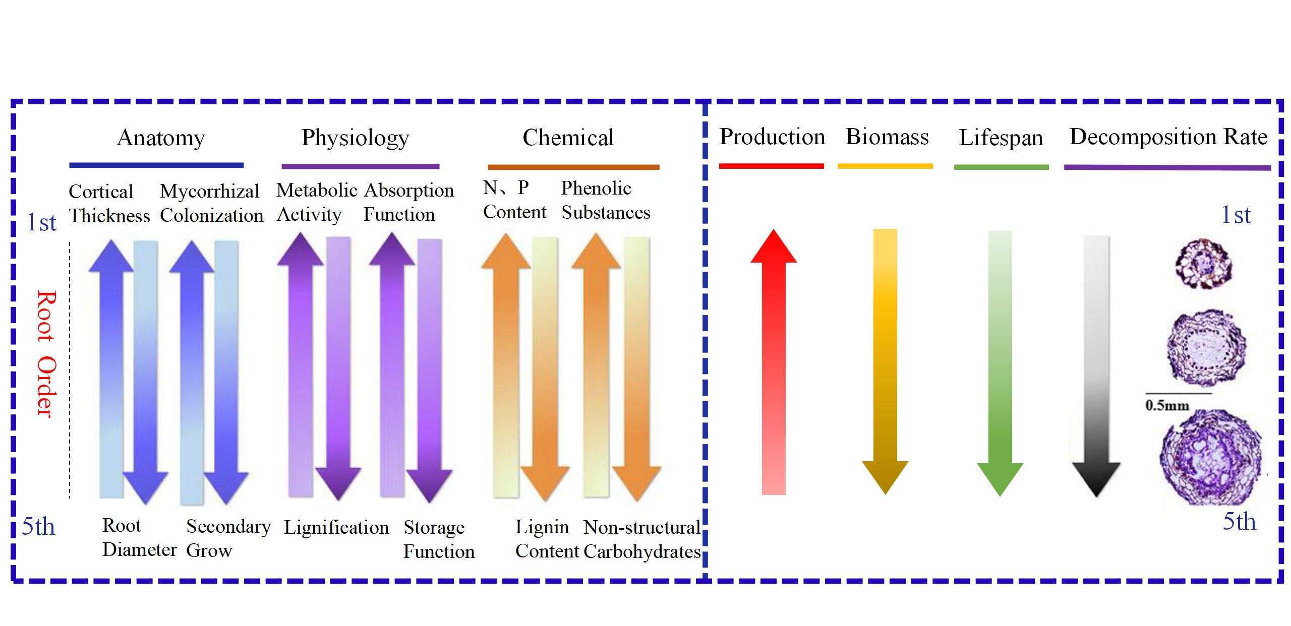 盡管吸收根(1-3級根)的生物量較低(僅占根系生物量的4%左右),卻主導著整株樹木根系的產量和周轉。通過整合全球其它站點利用微根管技術監測吸收根的數據,發現全球森林樹木吸收根的平均壽命是226天,其中最短的是27天,最長的是656天。細根壽命的最佳預測模型參數包括細根直徑、細根氮濃度、年均溫度及降水量,預測解釋度為47%。吸收根的壽命隨氮含量的增加而減少,隨直徑的增加而顯著增加,特別是在年均溫度較低、降水較多的地點,細根具有較長的壽命(圖1)。此外,除常綠樹種外,細根壽命和葉片壽命不相關,這表明細根和葉片具有不同的進化選擇和周轉策略以適應地上和地下不同的環境條件。吸收根(1-3級根)由于具有較高的產量和周轉速率,然而衰老和死亡以后,分解速率卻較低(圖2),因此該根系模塊對森林土壤碳的貢獻可能居首位。依托該研究網絡監測的數據,初步估算吸收根輸入對森林土壤碳庫的貢獻可占整株林木根系的75%以上。