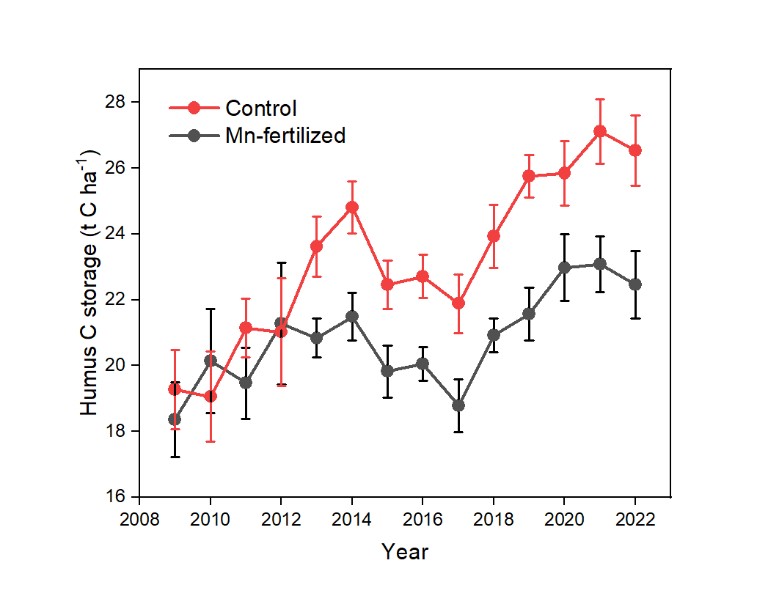 研究揭示了外生菌根真菌通過調控土壤錳元素循環促進了落葉松人工林腐殖質層碳庫積累的新機制。北方森林(Boreal forests)儲存了全球陸地生態系統24%以上的碳庫,其中大約64%儲存于地下。其儲存的碳庫主要位于腐殖質層中,包含正在分解的凋落物和其它有機物質。Agaricomycetes是高緯度地區落葉松人工林土壤中普通存在的一類外生菌根真菌,Agaricomycetes特異性產生的錳過氧化物酶通過驅動錳氧化還原循環,可以把腐殖質層中可利用的二價錳離子(Mn2+)轉化為活性三價錳離子(Mn3+),該活性三價錳離子與真菌分泌的草酸類螯合劑形成化合物,可穿透木質素和木質素類化合物的酚類結構,從而調控有機質分解和腐殖質層碳庫積累。基于此假設,研究團隊在大興安嶺寒溫帶落葉松人工林設置了長達14年的錳添加實驗(圖3),發現錳添加處理進行到第5年后,顯著改變了外生菌根真菌的群落組成并增加了腐殖層碳庫容量。本研究解析到的錳添加的滯后影響,可能是由于外生菌根真菌需要一定周期后才能適應錳有效性的增加和土壤環境的變化。