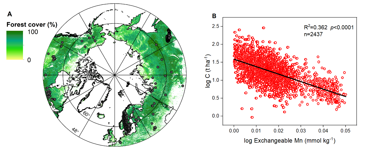 對我國大興安嶺落葉松人工林318個樣點腐殖層碳庫的調查研究,也表明腐殖質層可交換態錳含量是調控碳庫的重要調控因子(r2=0.20)。同時,結合瑞典國家森林土壤清查、瑞典國家森林清查數據以及數據整合分析的手段,建立了覆蓋全球北方森林范圍的2437個樣點的腐殖質層碳儲量數據,發現可交換態錳含量可以解釋北方森林腐殖層碳庫36%的變化(圖4)。研究結果與長期錳添加實驗相互驗證和補充。