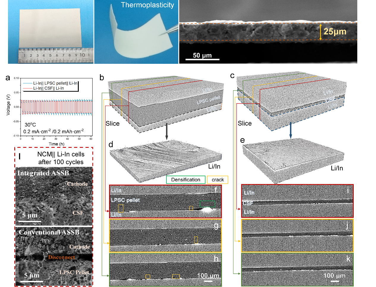 研究團隊針對目前干法制備過程中各組分分散不均問題,提出低壓力制備的熔融粘結策略,在粘流態下將低粘度的熱塑性聚酰胺(TPA)與硫化物Li6PS5Cl進行預混,較低壓力下(≤ 5MPa)熱壓成型,誘導TPA在硫化物顆粒間隙滲透,構建聚合物逾滲網絡,實現超薄成膜(厚度≤ 25 m)的同時,兼具優異的柔韌性、熱塑性、可彎曲性、拉伸性和較高離子電導率(2.1 mS/cm)。使用同步輻射X射線斷層掃描(SX-CT)對循環過后的對稱電池進行觀測,發現該超薄膜能夠有效抑制循環過程中因電極體積膨脹帶來的界面分離和電解質碎裂等問題,保持界面穩定,證明在固態電解質內部構建完整的聚合物逾滲網絡,不僅有利于其薄層化,更有利于耗散電池運行過程中的不均勻內應力,降低力機械失效風險。